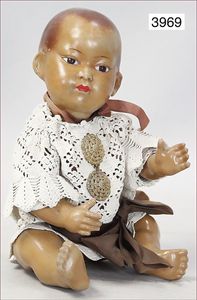 PETIT COLLIN Celluloid, Asiate, 32 cm, Kurbelkopf, braune fest eingesetzte Glasaugen, bewegl. Arme und Beine, bespielt, Abriebstellen am Hinterkopf