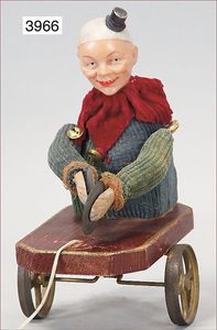 Zugspiel, Clown, Schildkröt-Einbindekopf, Celluloid, mit anmodelliertem Hut, Gussspeichenräder, auf Holzbrett montiert