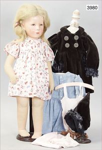 KÄTHE KRUSE Deutsches Kind, Ilsebill, Puppe Nr. 7, 52 cm, Stoffkopf, deutlich sichtbare Hinterkopfnaht, blaue gemalte Augen, ein wenig Farbabrieb im Gesicht, Trikotkörper im guten Zust., Orig.-Kleidung und Unterkleidung, 1 Tüte zusätzliche Kleidung, teils älter, teils neuer