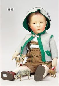 KÄTHE KRUSE Puppe Nr.1, 40 cm, Stoffkopf, 3 Hinterkopfnähte, separat angenähter Daumen, Stoff am Hals sowie am Körper etwas unterschiedlich, jedoch zeitl. genau passend, da es sich hierbei um einen Dachbodenfund handelt, nach unserer Auffassung orig., reichh. zusätzliche Kleidung und Zubehör aus der Familie, schöner Orig.-Zust.