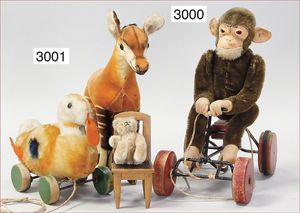 STEIFF Konv. 3 Teile, 1 x Bär 8 cm auf Stuhl, mit silbernem Knopf, guter Zust., 1 x Steiff Okapi, mit silbernem Knopf, Stehhöhe 28 cm, dazu 1 Ente auf Holz-Exzenterrädern, ohne Knopf, Schild und Fahne, oberer Teile des Filzschnabels fehlt