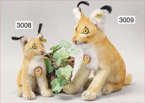 STEIFF Luxy, Luchs, sitzend, kompl., mit Knopf, Schild und Fahne, Nr. 3317,00, drehbarer Kopf, sehr schöner unberührter Orig.-Zust., 19 cm