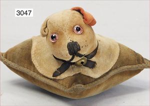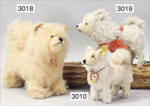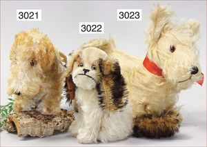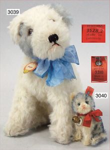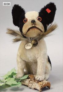 STEIFF Hund Peter, mit unbespielter roter Fahne, Nr. 3528,2, mit Brustschild, Aufschrift: Peter, Wollplüsch, teilw. Orig. blaue Färbung, drehbarer Kopf, Sitzhöhe ca. 27 cm, Druckstimme funktionstüchtig, KFS, unbespielter Orig.-Zust., selten