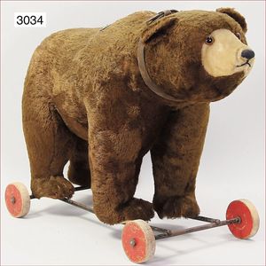 STEIFF Vorkrieg, Reittier, Braunbär, mit Zugstimme (intakt), Holzräder, teils ein wenig Mohairverlust, insgesamt guter Zust., mit Knopf, Reste roter Fahne, 62 cm