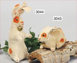 STEIFF Rabbit, ca. 1910, 12 cm, 4410, Samt gefleckt, 12 cm, aufwartend, mit Knopf, weißer Fahne, Orig.-Glocke, sehr guter Zust.