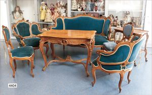 schöne Sitzgruppe, Neobarock, (kein Spielzeug), 1 Orig.-Sofa, Tisch, 2 Sessel, 4 Stühle, Beistelltisch, Serviertisch, Holzteile meist gut, Stoff altersbed. verschmutzt, sehr dekorativ