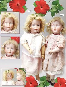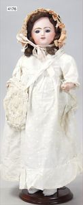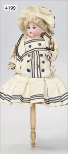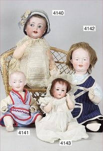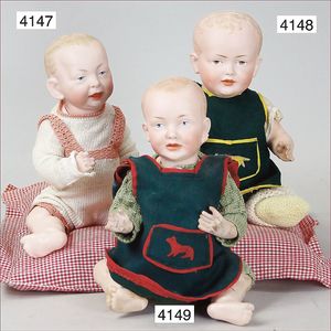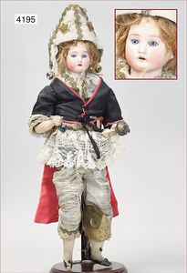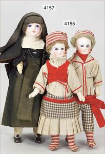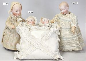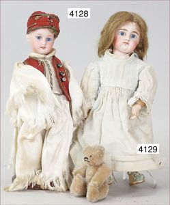 Biskuitporzellan-Geradhalspuppen, 1 x Mädchen, fest eingesetzte blaue Paperweightaugen, geschl. Mund, Vollkopf, Mohairperücke fest aufgeklebt, auf Steh-Gliederkörper, feste Handgelenke, alte Kleidung, schönes helles Porzellan, ca. 22 cm Stehhöhe, dazu Junge, Vollkopf, fest eingesetzte blaue Paperweightaugen, geschl. Mund, fest aufgesetzte Mohairperücke, wurde nicht entfernt, Risse im Gesicht, Stehkörper, feste Handgelenke, ca. 23 cm Stehhöhe, schönes Konv.