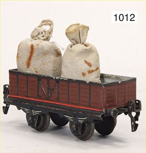 MÄRKLIN Spur 0, Hochbordwagen, 13,5 cm, Blech handlackiert, altes Märklin-Zeichen, 1 Puffer fehlt, bespielt