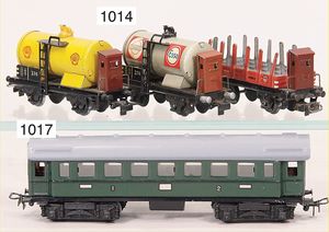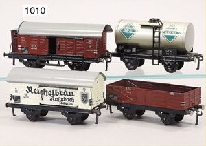 FLEISCHMANN Spur 0, 4 Teile Güterwagen, 1 x geschl. Güterwagen, mit Bremserhaus, 1 x Tankwagen Aral, 1 x geschl. Güterwagen Reichelbräu, 1 x Hochbordwagen, alles Zust. 2