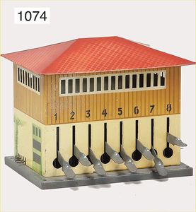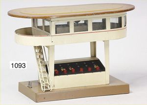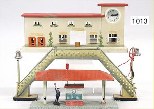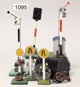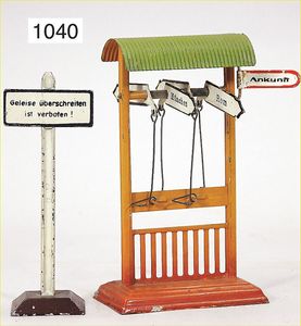Konv. Eisenbahnzubehör, Kibri, Signalbrücke, Bing, Richtungsanzeiger, 1 Richtungsanzeiger, Blech lithogr., Läutewerk, Bahnsteig, Gebäude, mit Läutewerk u. Signal, bespielt bis gut