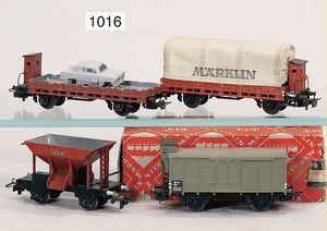 MÄRKLIN H0, 322, Planewagen, Guss, 312, geschl. Güterwagen, mit Bremserhaus, grau, Guss, kl. Lackfehler am Dach, sonst sehr guter Zust., 367, Talbordwagen, 1 Autotransportwagen, Zust. 2