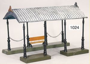 MÄRKLIN Uralt, Bahnhofshalle, 1 Bahnsteig mit Bank u. 4 Säulen, 2 geteilte Bahnsteige, mit 2 Profilsäulen, Hallendach zum Aufstecken, guter Zust., mit altersbed. Lackfehlern