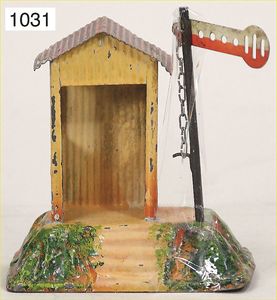 MÄRKLIN Uralt, kl. Bahnwärterhäuschen, mit Signal, Blech handlackiert, altes Märklin-Zeichen, bespielt, kl. altersbed. Lackfehler