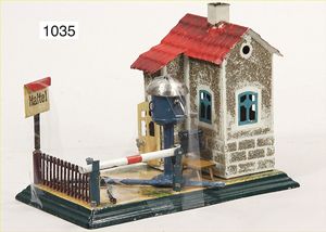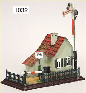 MÄRKLIN Uralt, Bahnwärterhäuschen mit Eckhaus, mit Schranke, Läutewerk, Signal- u. Halteschild, Grundplatte 17,5 x 10 cm, altes Märklin-Zeichen, guter Zust., selten