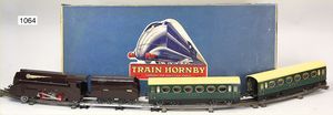 HORNBY Zugpackung, Spur 0 Stromlinien, Dampflok, 2B1, elektr. Ausführung, 4-achsiger Tender, 2 x 4-achsige Personenwagen, Gleismaterial, Transformator, im Orig.-Kart., guter Zust.