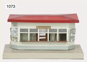 BING Zeitungshäuschen, Grundplatte x 8 cm, am Dach farbl. ausgebessert, Fahnen ergänzt, Höhe 14 cm