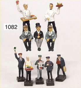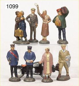 Konv. 8 Teile Eisenbahnfiguren, Lineol, 5 cm, Reisende, Schaffner, Zugpersonal, dazu 1 Motorrad, Zust. 2 -3