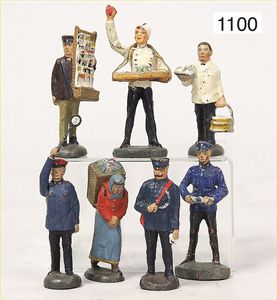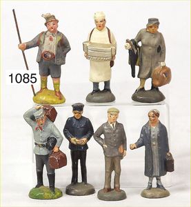 Konv. Spur 0, Lineol u. andere, Massefiguren, 7 Teile, Eisverkäufer, Reisende, Kofferträger, Wanderer, 5,5 cm, Zust. 2