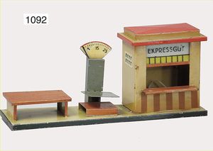KIBRI Expressgut-Annahme, mit Waage, Blech handlackiert, Grundplatte 30,5 x 8 cm, bespielt, Bodenplatte etwas verzogen, sonst guter Zust.