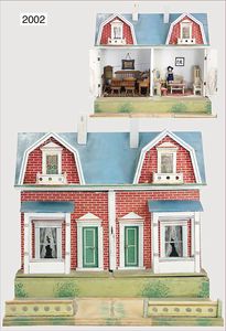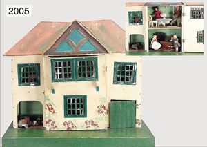 GOTTSCHALK Puppenstuben-Doppelhaus, ca. 1910, 46 cm hoch, 48 cm breit, 2 Eingangstüren, jeweils überbaute Fenster, Orig.-Außenbemalung, mit Backsteintapete, möbliert, kl. Vorgarten, Treppe u. Zaunteile fehlen, 1 Schornstein ergänzt, ausgefallen