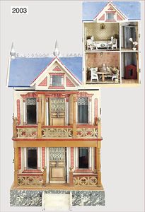 GOTTSCHALK Puppenstubenhaus, 59 cm hoch, 33 cm breit, überbauter Eingangsbereich, oben Terrasse mit bunt lithogr. Papier beklebt, vorne Fenster, seitl. Fenster, vorne 2 Türen, Fassade zum Öffnen, Orig.-Möblierung mit Treppe, schöner Orig.-Zust., schöne Gr., um 1900, mit Fahrstuhl (selten für diese Gr.)