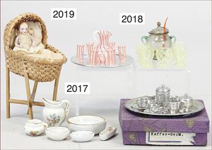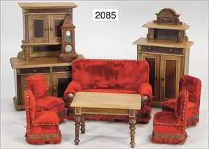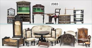 interessantes Konv. Puppenstubenmöbel, aus untersch. Möbelprogrammen, 1880 - 1900, darunter Sitzgruppe, Holz-/Presspappe, Sofa, 21 cm, Seide verschlissen, Sekretär, Boulle, 18,5 cm, Tisch, Stühle, Betten, teils kl. ausgebesserte Stellen o. Fehlstellen, schönes Konv. zum restaurieren u. ergänzen