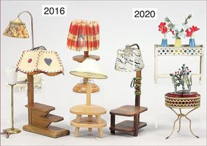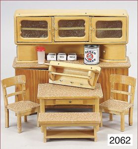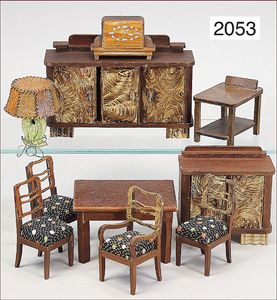 Puppenstubenmöbelprogramm, Schrank 17,5 cm, Kommode Tisch, Stühle, Lampe, Servierwagen, Uhr, 50er Jahre, guter Zust.