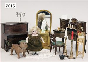ERHARD & SÖHNE Konv. Puppenstuben Ausschmückungsteile, Erhard & Söhne, Messing Blech vergoldet, Kamin mit Spiegel, kl. Kerzenleuchter, Boule Sekretär, Klavier, kl. Ganzbiskuitpuppe, 2 x Stühle, dazu 1 x Lineol Bulldogge