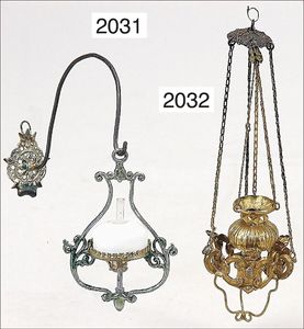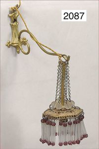 ERHARD & SÖHNE Messing/Blech vergoldet, Glasperlen montiert, mit Wandhalter, Zinn, Durchm. der Lampe 5 cm, für herrschaftl. Puppenstube