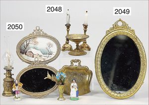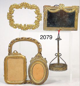 Konv. Bilderrahmen, teils Erhard & Söhne, Messing/Blech vergoldet, 8 cm - 11,5 cm, dazu 1 Spiegel, 1 Leuchter