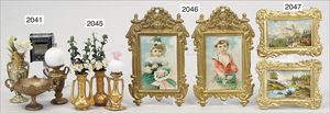 ERHARD & SÖHNE Messingblech, vergoldet, Schippe, 6 cm, 1 Leuchter, Zinn, kl. Zinnvase, Puppenstubenbild und Spiegel, Zinn, 2 kl. Nippesfiguren, Porzellan, 3,5 cm
