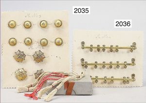 ERHARD & SÖHNE Messingblech vergoldet, 2 Musterkarten, 12 Vorhangshalterknöpfe, Orig.- Karton mit Vorhangskordeln