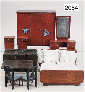 Puppenstubenschlafzimmer, Möbelprogramm, 50er Jahre, Schrankhöhe, 15,5 cm, 2 Betten, Nachttische, Spiegel, Stuhl, schöner Orig.-Zust.