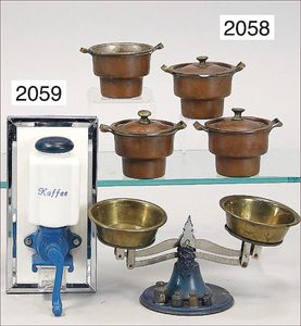 Konv. Puppenstubenausschmückungsteile, Zinn, Spiegel mit Garderobenhaken, 6,5 cm, 2 dreiarmige Leuchter, kl. Radio, Besteckkasten, Telefon, Kaffeemühle, etwas jünger