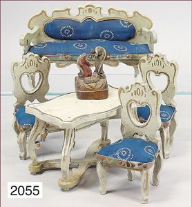Sitzgruppe, Holz, lackiert, früh, Sofa, 25,5 cm breit, 3 Stühle, Tisch, eine sakrale Szene, Kopf an Jesus fehlt