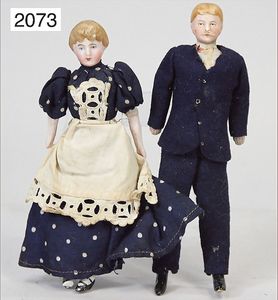 2 Puppenstubenpuppen, Mann, 16 cm, Biskuit-Brustblattkopf, fein ausmodellierte Haare, gemalte Augen, anmodellierter Schnurrbart, Stoffkörper, Biskuit-Arme u. -Beine, Haushälterin, Biskuit-Brustblattkopf-Arme u. -Beine, 1 Fuß bestoßen, Stoffkörper, 15,5 cm
