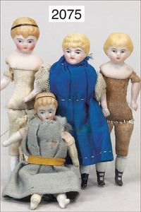 4 Puppenstubenpuppen, Kinder, 9,5 cm - 11 cm, Biskuit-Brustblattköpfe, -Arme u. -Beine, Stoffkörper, teils alte Kleidung