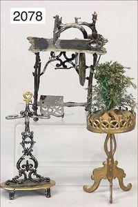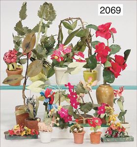 wohl MÄRKLIN Blumentisch, Blech, handlackiert, Beine nachgelötet, mit 2 Blechblumentöpfen, Durchm. 6 cm, 2 Blumenbänke Kibri, für Puppenstuben, oder Blumengeschäft