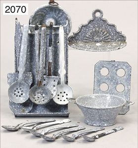 Konv. Puppenküchen-Ausschmückungsteile, grau/weiß emailliert, für mittelgr. Küche, Backform, Duchm. 5,6 cm, Sieb, Löffelhalter, Wandhalter, meist guter Zust., teils kl. Emaille Abplatzer