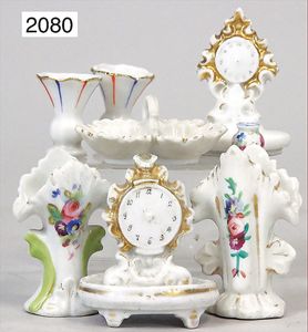 Konv. Puppenstuben-Ausschmückungsteile, Porzellan, 2 Uhren, Vasen, Schale, 3 cm - 5,5 cm, meist gut