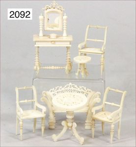 Konv. Puppenstubenmöbel, Bein, Frisiertisch, mit Spiegelaufsatz, Höhe 8, Beistelltisch, kl. Hocker, 3 Stühle, Bank, kl. Stellen geklebt, sonst gut
