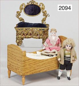 Bank, Messing/Blech vergoldet, Samtbezug, 10 cm hoch, 1 Puppenbett, 13,5 cm, 1 Ganzbiskuitpuppe, 9 cm, fester Kopf, braune fest eingesetzte Glasaugen, bewegl. Arme u.. Beine, 1 kl. Biskuit-Puppenstubenpuppe, Brustblatt, anmodelliertes Stirnband, Stoffkörper, Biskuit-Arme u. –Beine