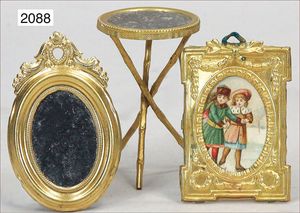 ERHARD & SÖHNE 2 Teile, Messing/Blech vergoldet, Spiegel u. Bild, Höhe 7,5 cm u. 8 cm, dazu kl. Beistelltisch, Messing/Blech vergoldet