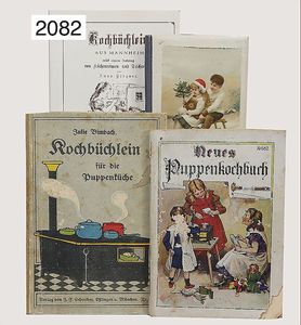 Konv. 5-tlg., Puppenkochbuch, "Kochbüchlein für die Puppenküche", Juli Rinnbach, Verlag Schreiber, "Neues Puppenkochbuch für die Puppenküche", Elenore Horn, Reutlingen, dazu 1 Notizblock, 1 Puppenkochbuch neuerer Druck