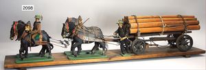 Holzwagen mit 4 Zugpferden, 1,37 m, auf Holzbrett montiert, mit 2 Waldarbeitern, aufwendig geschnitzt, naturgetreu nachgebildetes Zaumzeug, davon einige Stellen ergänzt, sehr dekorativ, ca. 1910