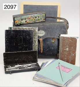 Schulranzen, ca. 1930, Leder, mit Blechschild E. Michl, befüllt mit vielen Schulheften, Schulbücher, Tafel, Griffelkasten, Zeugnisse, von mehreren Generationen, angefangen 1891, darunter 1 Schulentlassungszeugnis der Stadt Heidelberg 1895, Zeugnishefte ab 1887, Dachbodenfund aus Lehrerhaushalt, Ranzen altersbed. verschlissen