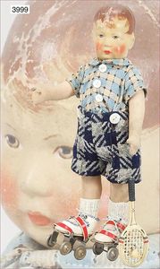 BING Stoffpuppe, deutlich sichtbare Hinterkopfnaht, braune gemalte Augen, ein wenig Farbverlust auf der Stirn, sonst schöne Bemalung, alte Kleidung mit Rollschuhen, 30 cm