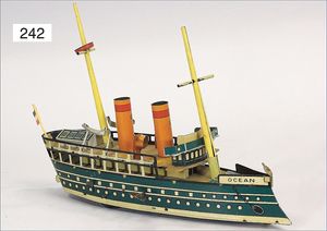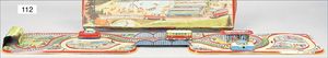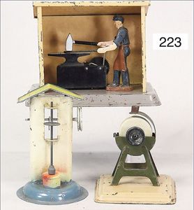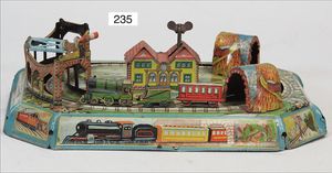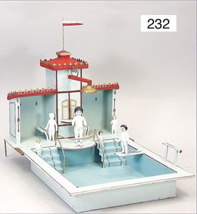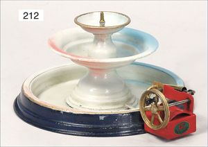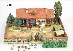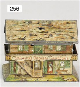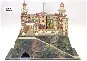 wohl KIBRI Festungsanlage, Blech handlackiert, Uralt, 44 x 44 cm, Zugbrücke, Geschützturm, 2 Gläser vorhanden, 4 Gläser fehlen, Kerzenbeleuchtung, ringsum 4 Wachtürme, unberührter Orig.-Zust., 3 Orig.-Fahnen, einige Lötstellen lose, Seitenwand u. 2 Türme, schöne Orig.-Lackierung, mit einigen altersbed. Lackfehlern, unberührter Dachbodenfund