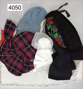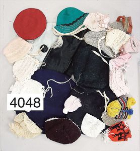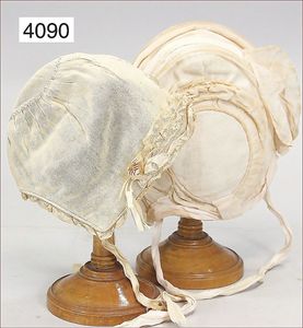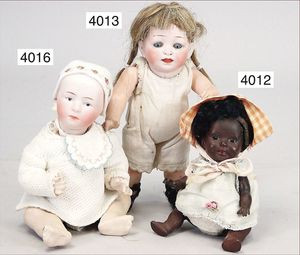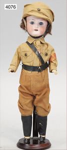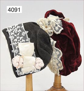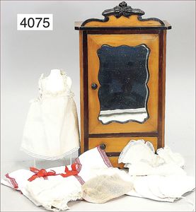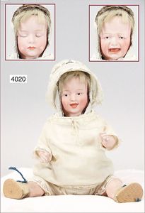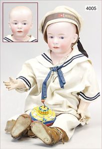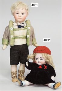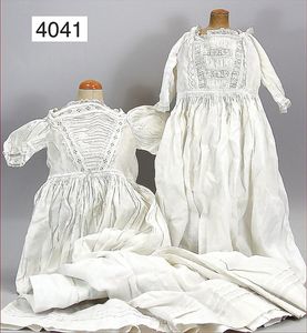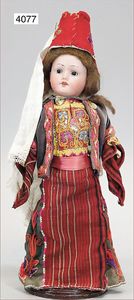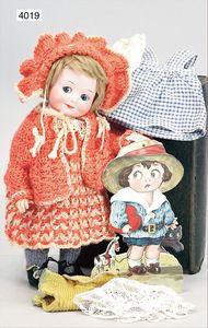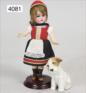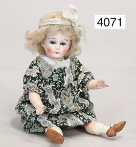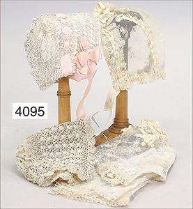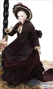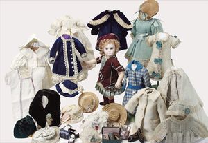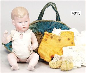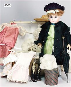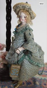 JUMEAU frühe Primére Jumeau, 1. Serie, franz. Bébé, Biskuitporzellan-Kurbelkopf-Puppe, gem. Nr. 6, große Anzahl an ausgefallener alter passender Kleider, blaue, fest eingesetzte Strahlenaugen, geschl. Mund, durchst. Ohren, sehr helles Porzellan, fein schattierte Augenlider, franz. Gliederkörper, frühe ausmodellierte Hände, mit festen Handgelenken, 8 lose Kugeln, sehr schöner Zust., alter Korkdeckel, blonde, lockige unberührte Mohairperücke, alte schöne Kleidung u. Unterkleidung, lilafarben mit mintfarbener Seide, schöner Orig.-Zust., Kleid absolut unberührt und orig., alte orig.-Jumeau Schuhe, 40 cm, dazu kl. Eiertasche, Leder, innen mit Häkelutensilien, blaue Seide, ausgefallen, absolutes Spitzenstück, extrem selten