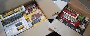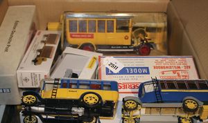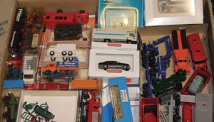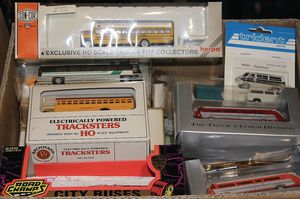 Fundkiste, ca. 15 Teile Busse, versch. Hersteller, versch. Gr., Blech- u. Kunststoff, alles neu im Kart.
